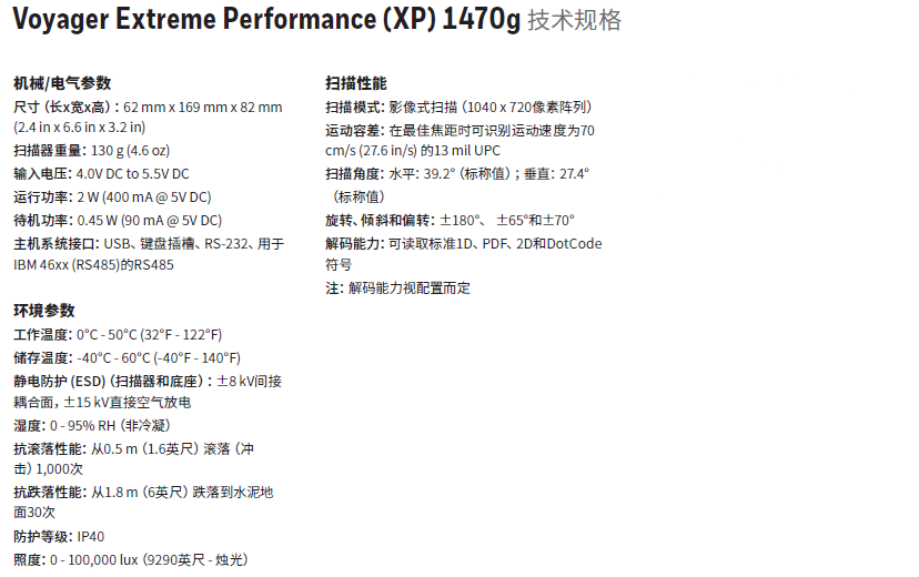 霍尼韋爾1470G二維碼掃描槍具有與前代產品一樣有競爭力的價格,且比之前的型號或同類競爭產品提供更好的耐用性和更強大的掃描功能。霍尼韋爾honeywell. 1470G對于采用 1D 和 2D 條碼讀取并且需要更強大和可靠解決方案的店內零售工作流程,它們是理想的手持式掃描儀選項。我們設計了 Voyager XP 1470 系列掃描儀,幫助確保為您的零售員工和客戶提供更好的體驗。其增強的低質量和破損條碼讀取能力可為每個人避免令人沮喪的結賬體驗。擴展的掃描距離直達客戶購物車的底部,而長距離的藍牙范圍使速通或旺季衛星 POS 站具有更高的操作靈活性。霍尼韋爾Voyager XP 1470 系列掃描儀可應對繁忙銷售點掃描的苛刻要求——經設計可承受從 1.8 米(6 英尺)高處的 30 次跌落和 0.5 米(1.6 英尺)范圍的 1,000 次滾動——同時提供比同類解決方案更高的精度。我們在標志性的 Voyager 系列手持式掃描儀平臺上構建 霍尼韋爾1470二維碼掃描槍,因此它們與您已有的 Voyager 附件完全向后兼容,降低了總擁有成本。